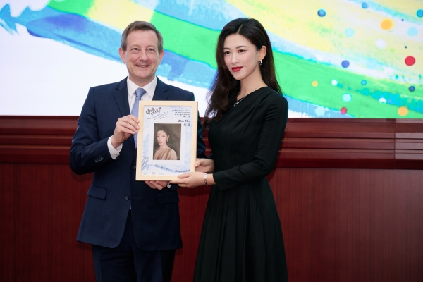 法国驻华大使白玉堂为演员朱珠颁发第12届中法环境月推广大使证书