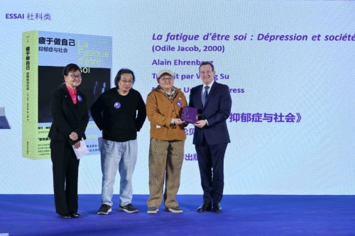 左起:傅雷奖常任评委端木美,特邀嘉宾汪民安,社科类获奖者王甦,法国驻华大使白玉堂。